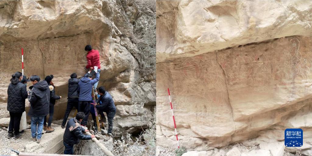 (左)工作人員正在對查果西溝B點摩崖石刻造像進行調查記錄,(右)該摩崖石刻造像現(xiàn)狀。(資料圖片由西藏自治區(qū)文物保護研究所提供)