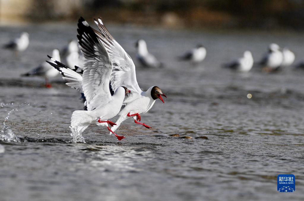 棕頭鷗在拉薩河上嬉戲(4月16日攝)。新華社記者 張汝鋒 攝