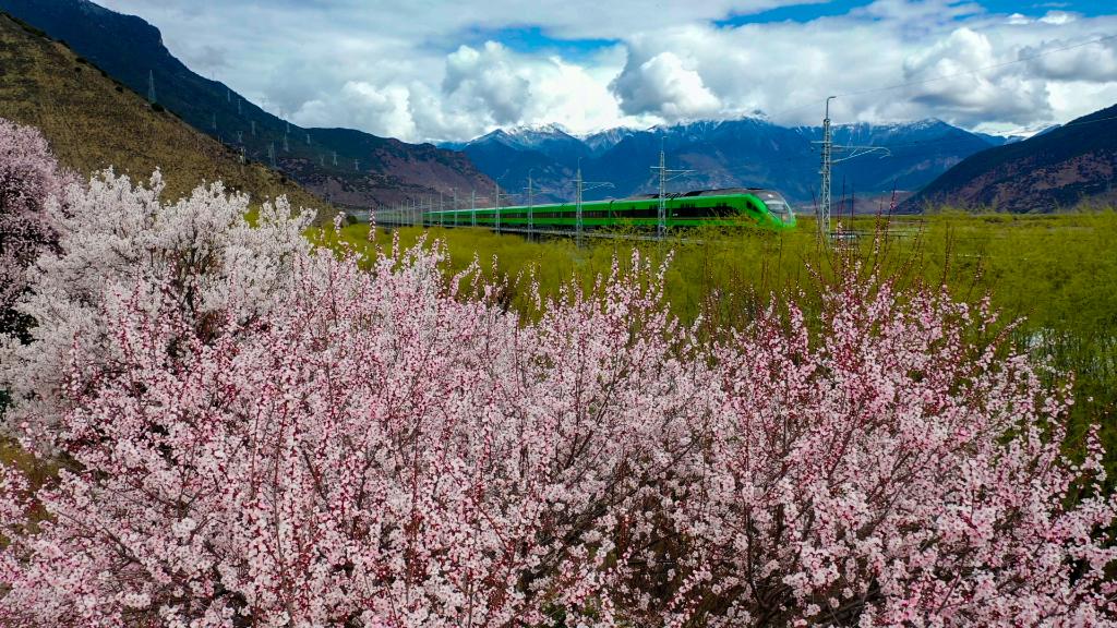 復(fù)興號(hào)列車行駛在兩側(cè)桃花盛開的拉林鐵路上(無人機(jī)照片,3月25日攝)。新華社記者姜帆 攝