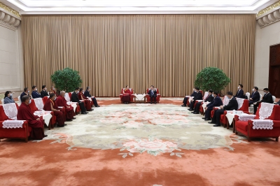 四月二十五日,河南省委書記樓陽生、省長王凱在鄭州會(huì)見班禪額爾德尼·確吉杰布一行。 記者 董亮 攝