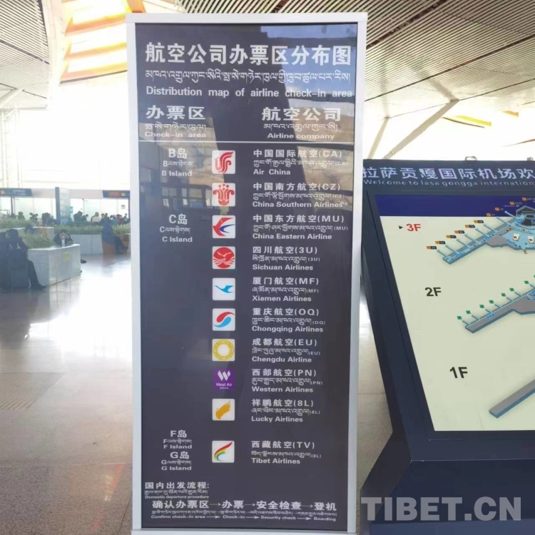 無托運行李的旅客持個人身份證(或有效證件)前往自助值機區(qū)打印登機牌。有托運行李和中轉(zhuǎn)聯(lián)程航班的旅客前往人工柜臺辦理。其中,乘坐西藏航空公司航班的旅客進(jìn)入出發(fā)大廳后左轉(zhuǎn)前往F、G島辦理乘機手續(xù),其他航空公司的旅客請前往B、C、D島辦理乘機手續(xù)。