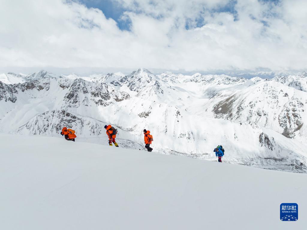 5月3日,登山愛好者正在向海拔6010米的洛堆峰峰頂進發(fā)(無人機照片)。新華社記者 孫非 攝