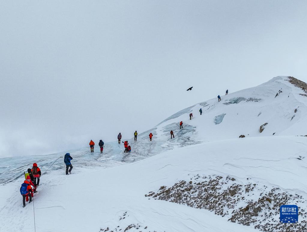 5月3日,登山愛好者正在攀登海拔6010米的洛堆峰(無人機照片)。新華社記者 孫非 攝