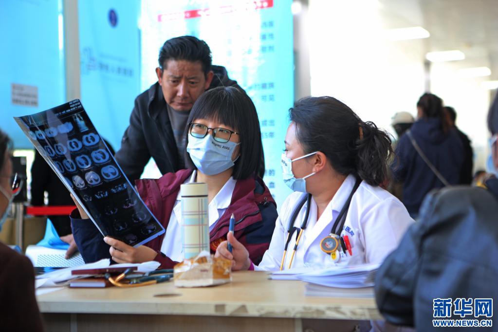 圖為“京藏?cái)y手,護(hù)佑藍(lán)唇”義診活動(dòng)現(xiàn)場(chǎng),楊蘇喬醫(yī)生(左一)在為患者診治疾病。(5月5日攝)