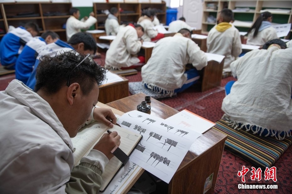 5月7日,西藏山南市,加查縣中學(xué)學(xué)生和教師在上藏文書(shū)法興趣班。該興趣班由2名藏文教師任教,每周兩課時(shí),利用自習(xí)課或晚自習(xí)時(shí)間為學(xué)生和教師授課。課程內(nèi)容包含執(zhí)筆、運(yùn)筆、姿勢(shì)等基礎(chǔ)書(shū)寫(xiě)技能,以及藏文中的烏金體、珠擦體、簇仁體、簇通體等各類字體的書(shū)寫(xiě)方法。