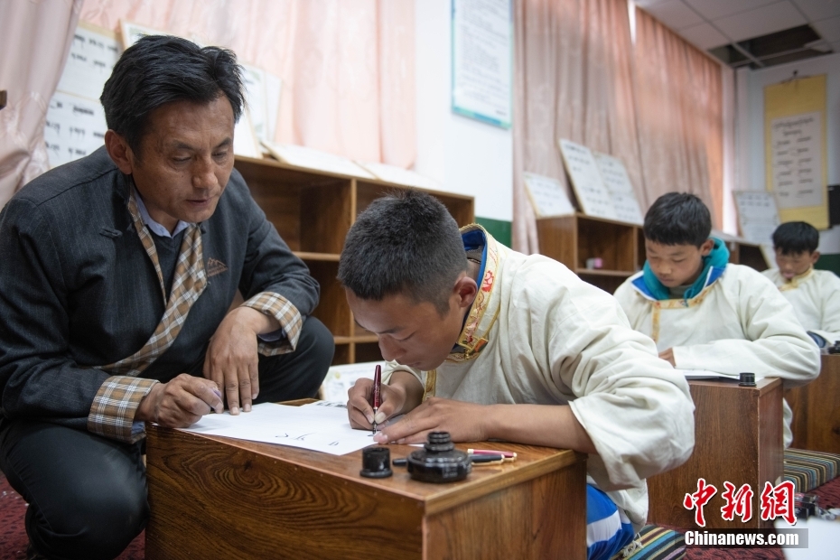 5月7日,西藏山南市,加查縣中學(xué)藏文書(shū)法興趣班的教師扎西達(dá)瓦給學(xué)生們上課。該興趣班由2名藏文教師任教,每周兩課時(shí),利用自習(xí)課或晚自習(xí)時(shí)間為學(xué)生和教師授課。課程內(nèi)容包含執(zhí)筆、運(yùn)筆、姿勢(shì)等基礎(chǔ)書(shū)寫(xiě)技能,以及藏文中的烏金體、珠擦體、簇仁體、簇通體等各類字體的書(shū)寫(xiě)方法。