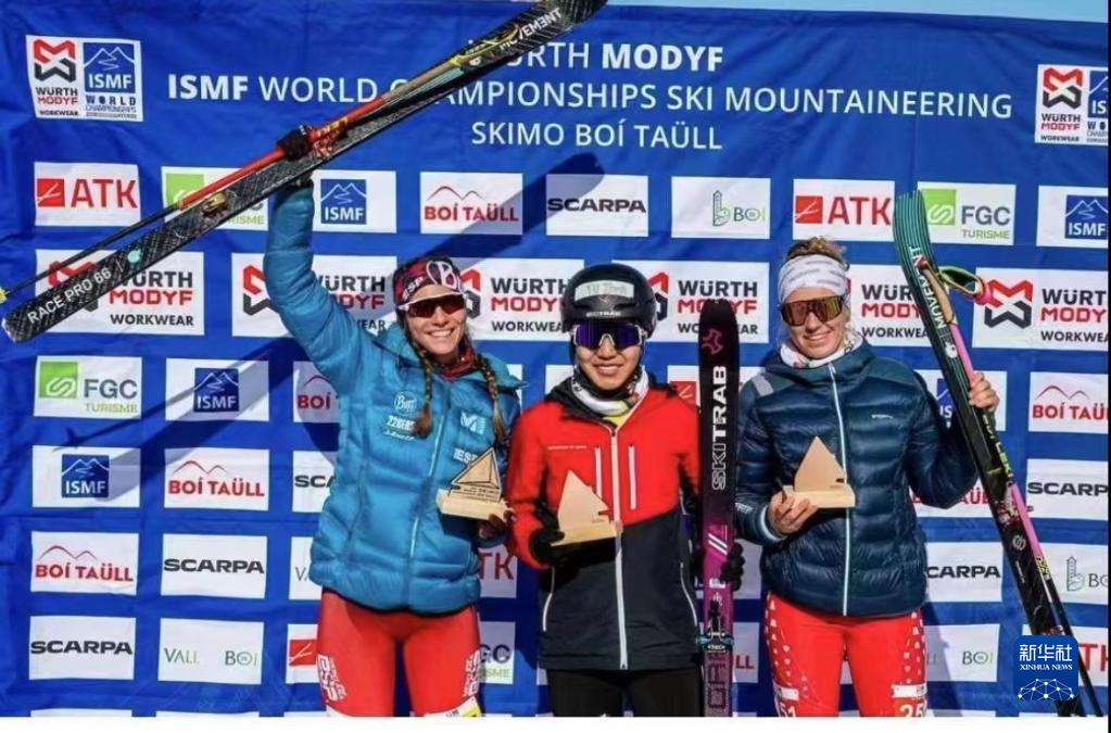 在西班牙加泰羅尼亞舉行的2023滑雪登山世錦賽上,冠軍中國運動員玉珍拉姆(中)在女子U20組短距離項目頒獎儀式上(2月28日攝)。新華社發(fā)
