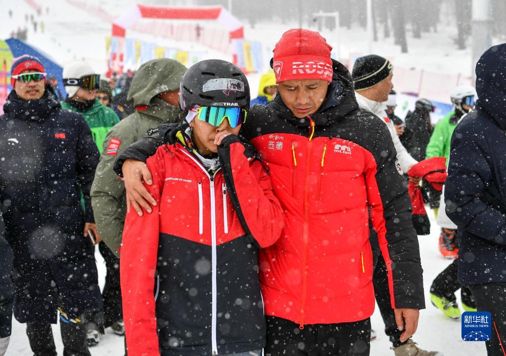 在全國首屆滑雪登山冠軍賽短距離(女子組)比賽后,西藏代表隊教練組人員安慰在比賽中失誤的玉珍拉姆(前左)(4月8日攝)。新華社記者 胡虎虎 攝