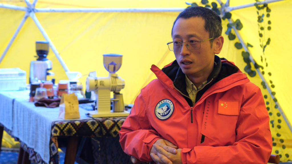 中國科學(xué)院西雙版納熱帶植物園的研究員蘇濤在珠峰登山大本營接受新華社記者采訪。