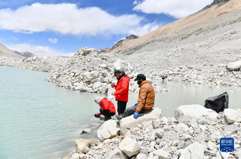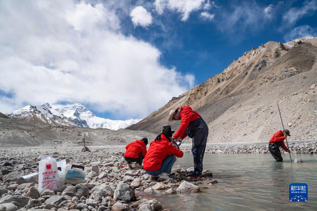 在珠峰登山大本營附近,來自西藏大學生態(tài)環(huán)境學院的科考隊員在采集水生生物樣本(5月22日攝)。新華社記者 孫非 攝