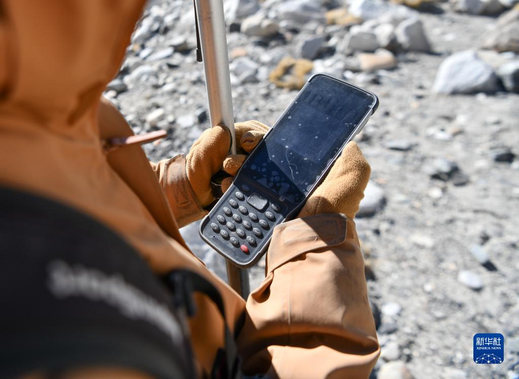 在珠峰海拔約5300米處,來自中國科學院西北生態(tài)環(huán)境資源研究院的科考隊員薛雨昂在對冰川進行實時差分GPS定位(5月15日攝)。新華社記者 晉美多吉 攝