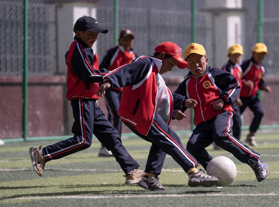 扎西宗鄉(xiāng)完全小學(xué)的學(xué)生在體育課上踢足球(6月5日攝,無人機(jī)照片)。
