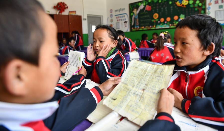 扎西宗鄉(xiāng)完全小學(xué)的學(xué)生在上藏文課(6月5日攝)。