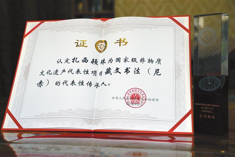 2018年,扎西頓珠被評為國家級非物質文化遺產代表性項目藏文書法(尼赤)的代表性傳承人。