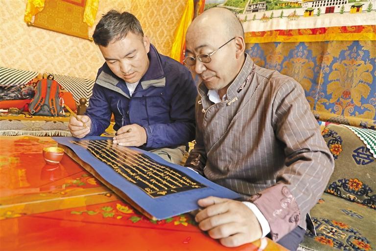 扎西頓珠和徒弟洛桑在藍青紙上抄寫藏文文獻。