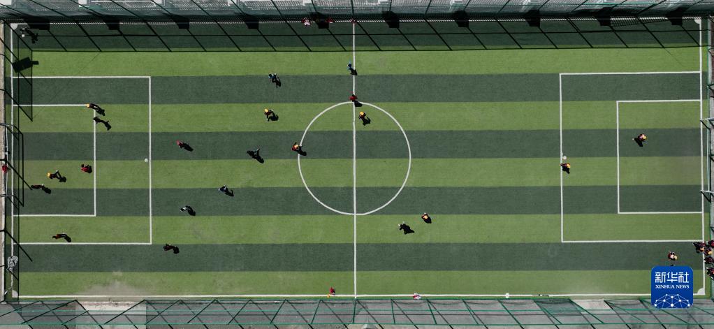 扎西宗鄉(xiāng)完全小學的學生在體育課上踢足球(6月5日攝,無人機照片)。新華社記者 晉美多吉 攝