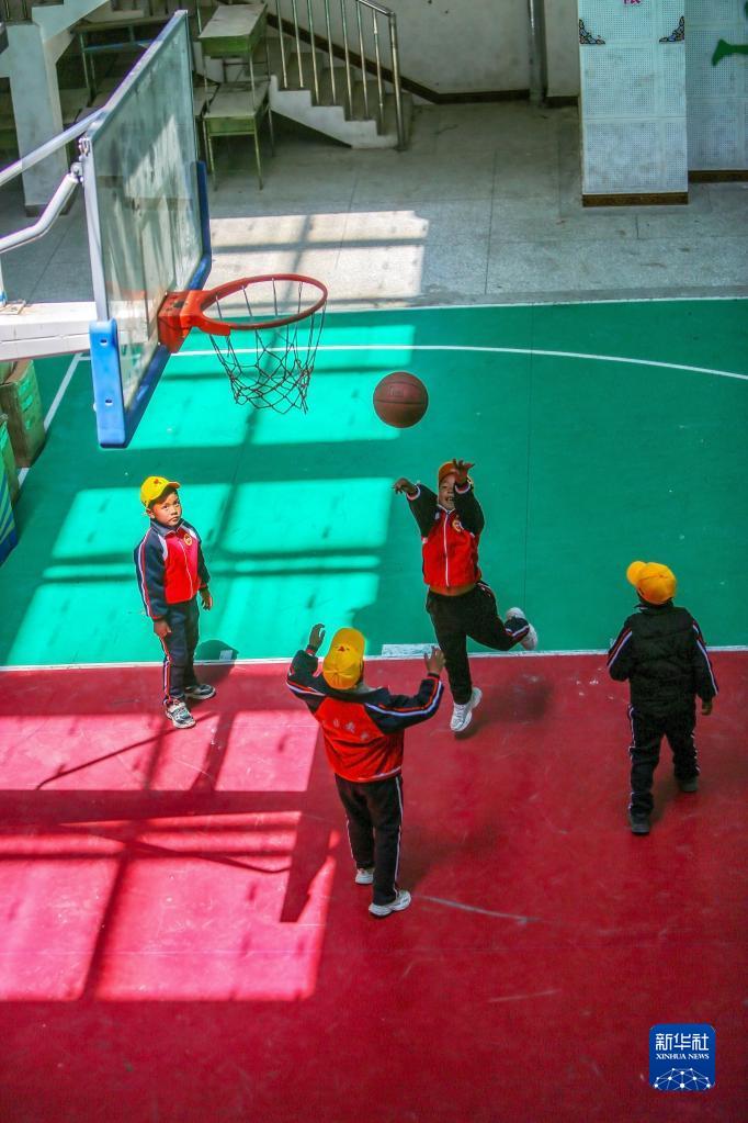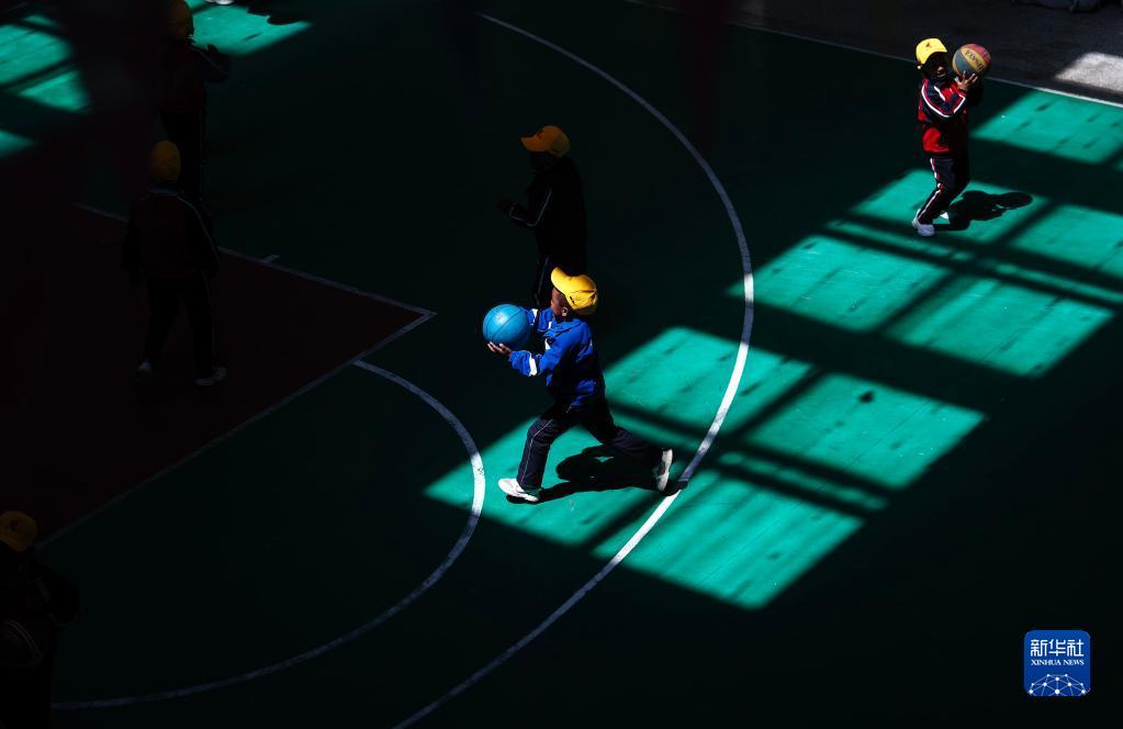 6月5日,扎西宗鄉(xiāng)完全小學學生在籃球課上投籃。新華社記者 邵澤東 攝