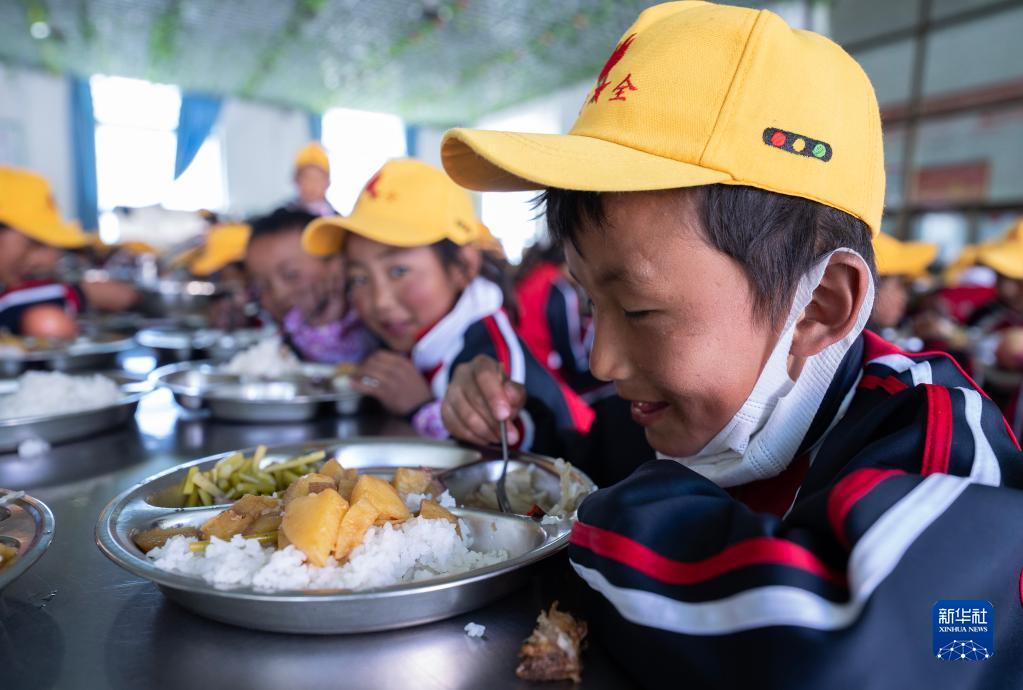 6月5日,扎西宗鄉(xiāng)完全小學的學生在食堂吃午飯。新華社記者 費茂華 攝