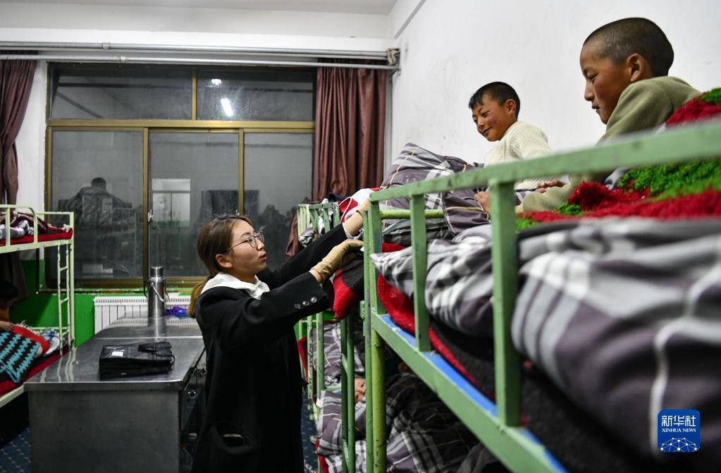 扎西宗鄉(xiāng)完全小學的值班老師在檢查孩子睡覺時是否蓋好被子(6月5日攝)。新華社記者 晉美多吉 攝