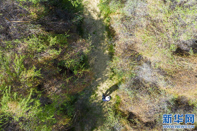 6月8日,索朗拉杰在沙棘林里(無人機(jī)照片)。新華網(wǎng) 旦增努布 攝