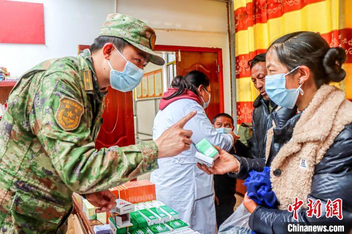 圖為醫(yī)療隊(duì)為村民發(fā)放藥品,并告知服藥方法?!≈煳男?攝