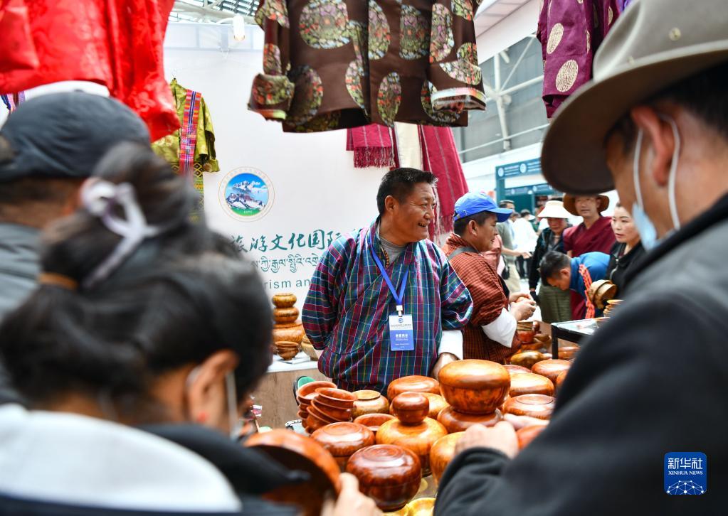 展會(huì)上的不丹商人向顧客銷(xiāo)售不丹服裝和木碗(6月18日攝)。新華社記者 晉美多吉 攝