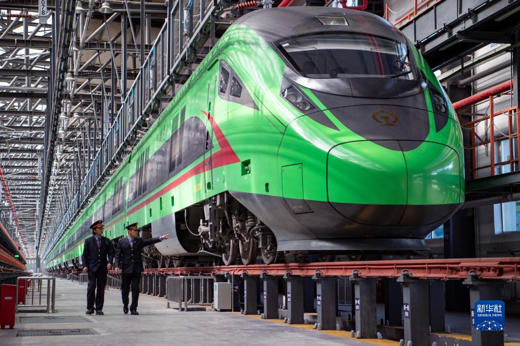 在拉薩機(jī)輛整備中心,“復(fù)興號(hào)”動(dòng)車組在檢修庫進(jìn)行整備作業(yè)(1月11日攝)。新華社記者 孫非 攝
