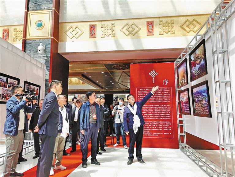 圖為“峰·彩”魯藏書(shū)畫攝影作品交流展上,工作人員在講解作品。