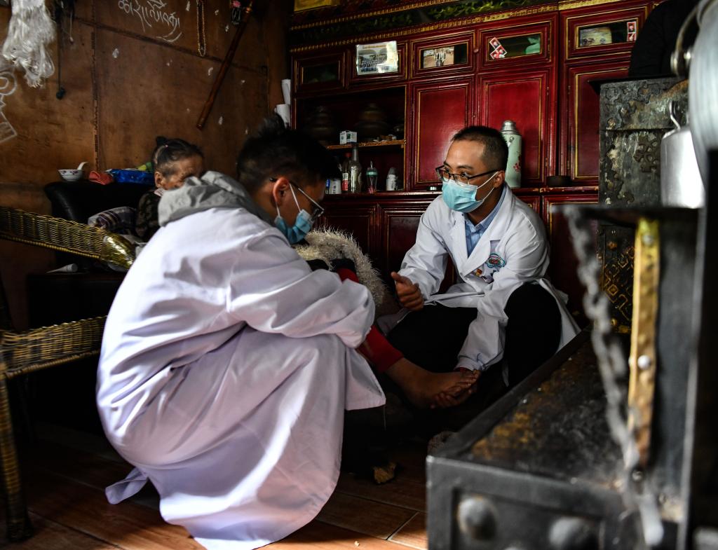 王振疆醫(yī)生在檢查娘姑腳的同時(shí),現(xiàn)場給當(dāng)?shù)夭刈遽t(yī)生尼瑪益西講解檢查時(shí)需要注意的地方(6月12日攝)。新華社記者 晉美多吉 攝