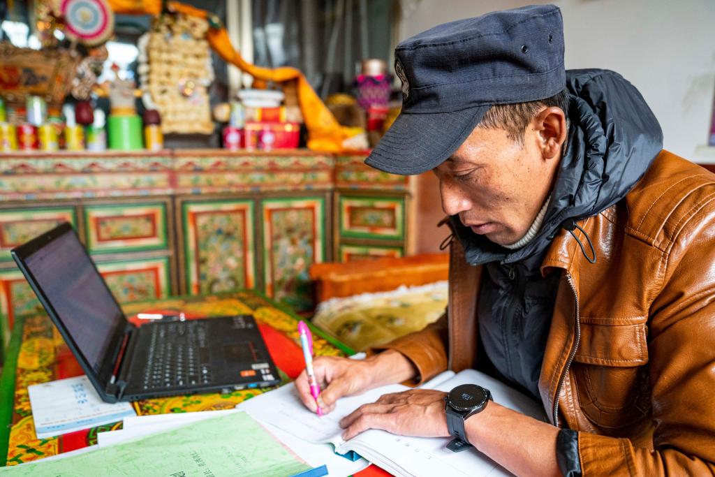 扎西次仁在填寫工作日志(6月30日攝)。新華社記者 孫非 攝
