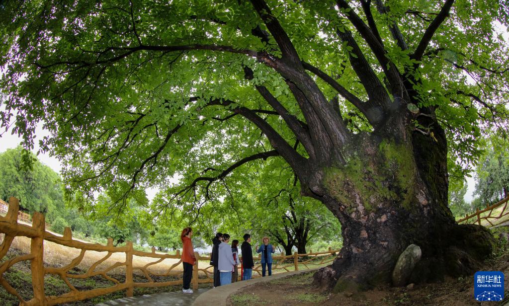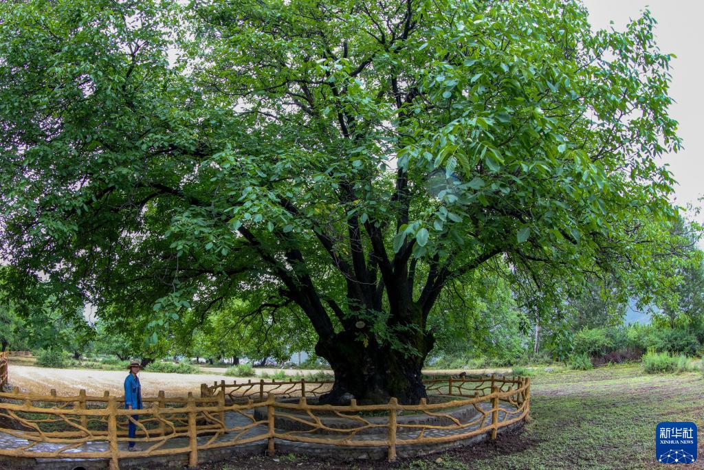 劉利平博士在加查縣安繞鎮(zhèn)熱果村查看一株樹(shù)齡1800余年的古核桃樹(shù)(7月27日攝)。新華社記者 旦增尼瑪曲珠 攝