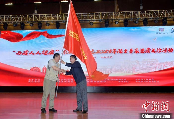 8月9日,“西藏人人健康”2023年院士、專家進(jìn)藏義診活動(dòng)啟動(dòng)儀式上,西藏自治區(qū)副主席甲熱·洛桑丹增(圖右)為義診專家團(tuán)隊(duì)代表授旗。李林 攝