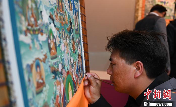 圖為活動(dòng)現(xiàn)場,唐卡畫師展示唐卡繪制。趙朗 攝