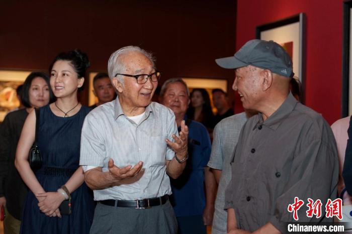 “藏色——巴瑪扎西畫展”亮相中國美術(shù)館,圖為中國美術(shù)家協(xié)會(huì)名譽(yù)主席、著名畫家靳尚誼(前排左一)與藏族畫家巴瑪扎西(右一)交流。 伴藏文化供圖
