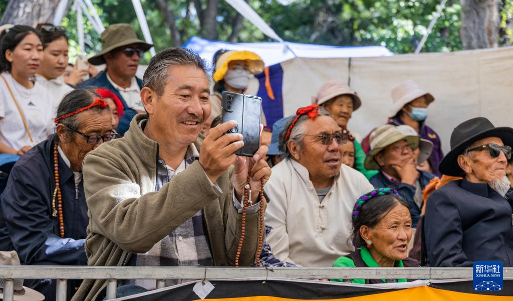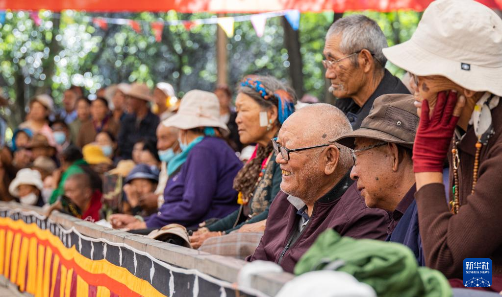 8月19日,在拉薩市羅布林卡園林內(nèi),觀眾在觀看藏戲表演。新華社發(fā)(丁增尼達攝)