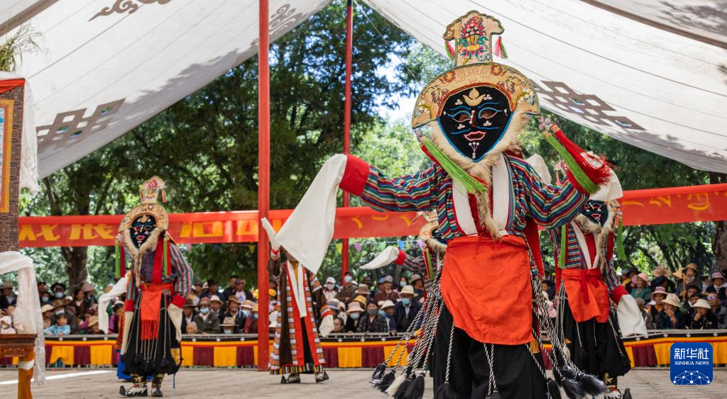 8月19日,在拉薩市羅布林卡園林內(nèi),貢嘎縣乃薩藏戲隊在表演藏戲《朗薩雯崩》。新華社發(fā)(丁增尼達攝)