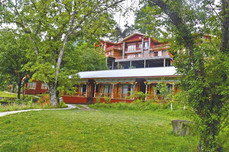 仁青客棧位于離波密縣城10公里處的古鄉(xiāng)巴卡村。穿過江上的石橋,走進(jìn)客棧簡樸的大門,一棟棟樣式別致的建筑矗立于山坡之上,院中鮮花盛開,綠草茵茵。沿著臺階拾級而上,遠(yuǎn)處秀美的風(fēng)光一目了然。
