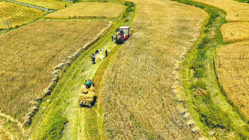 桑普村村民使用機(jī)械收割小麥。記者 阿旺尼瑪 攝