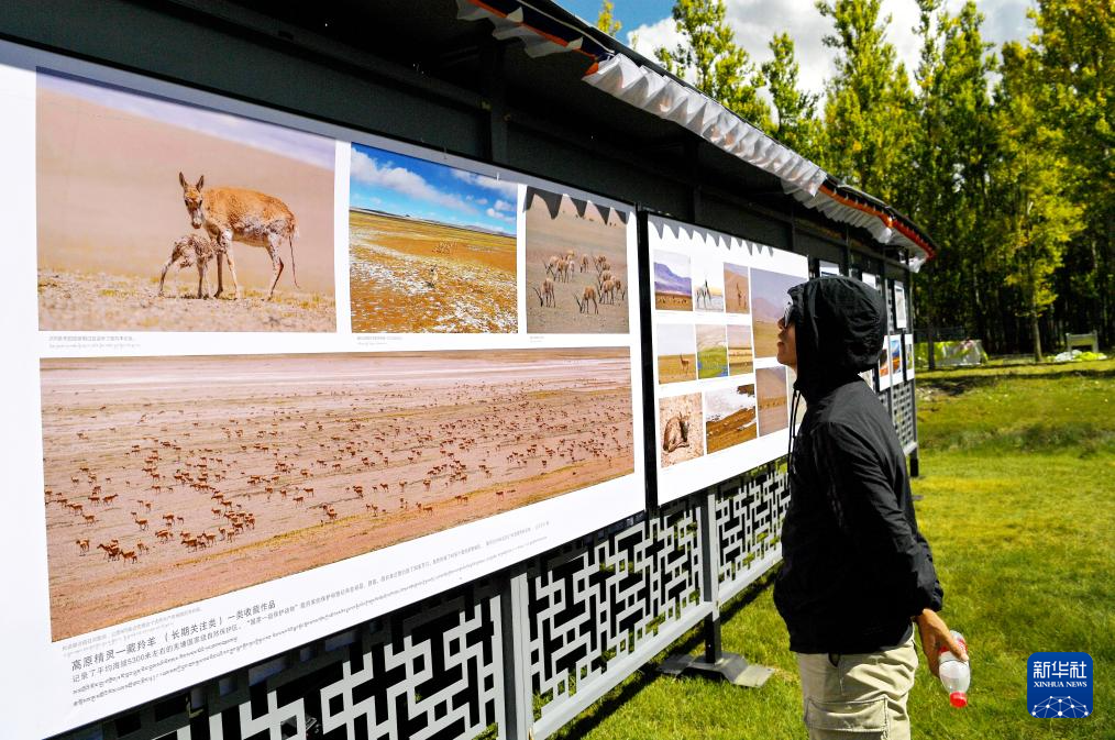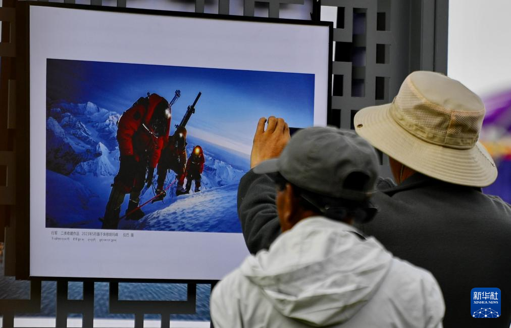 在拉薩市林周縣邊交林鄉(xiāng)當(dāng)杰村,人們?cè)谛蕾p第十六屆西藏珠穆朗瑪攝影大展作品(9月8日攝)。新華社記者 張汝鋒 攝?