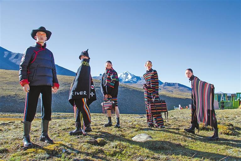 以萬(wàn)里晴空為幕,以乃欽康桑雪山為背景。隨著富有濃郁藏族風(fēng)情的銅鈴聲響起,模特們身著40套款式各異的創(chuàng)新氆氌工藝服飾,陸續(xù)登場(chǎng),為觀眾呈現(xiàn)了一場(chǎng)震撼心靈的視覺(jué)盛宴。