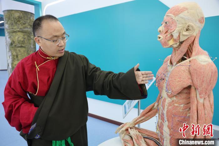 9月23日,青海大學(xué)藏醫(yī)學(xué)院副教授普措多杰介紹解剖姿勢塑化造型?!≈行律缬浾?張?zhí)砀?攝