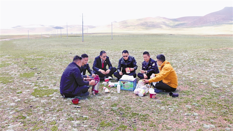普瑪江塘中心法庭干警下鄉(xiāng)途中在野外就餐。