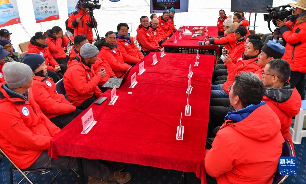 在海拔4950米的卓奧友峰科考大本營,科考隊員趙華標(手拿麥克風(fēng)者看電腦者)宣讀剛剛接收到的頂峰氣象觀測數(shù)據(jù),標志著峰頂自動氣象站架設(shè)成功,成功傳回觀測數(shù)據(jù)(10月1日攝)。