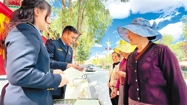 圖為山南市瓊結縣市場監(jiān)督管理局執(zhí)法人員向群眾發(fā)放知識產權相關宣傳冊。記者 白瑪澤旺 通訊員 倫珠澤仁 攝