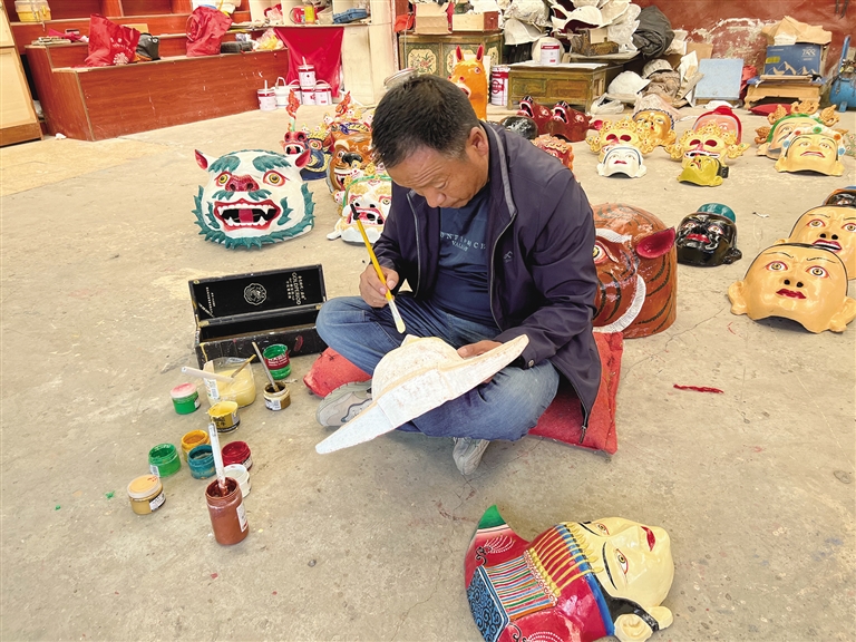 合作社里有一個(gè)展覽館,來到這里,西洛一改之前的冷靜,開心地向記者介紹起展陳作品。在眾多精美面具的襯托下,一尊破舊的塑像顯得有些格格不入。西洛告訴記者,這是他在一個(gè)偶然的機(jī)會(huì)下,從一位老者手上買來的?!斑@尊布塑佛像的年代已經(jīng)無從考證,但幾百年應(yīng)該是有的?!蔽髀迨詹睾螅瑢?duì)破損的布塑佛像進(jìn)行了大量研究、揣摩,憑借高超的技藝和藝術(shù)造詣,他將這份珍貴的工藝復(fù)制并傳承下來。那時(shí)起,將布塑技藝發(fā)揚(yáng)光大的想法逐漸在西洛心中埋下種子。隨著布塑面具市場不斷拓展,2012年,西洛在達(dá)孜區(qū)成立了達(dá)孜雪鄉(xiāng)民間傳統(tǒng)手工制作農(nóng)牧民專業(yè)合作社。