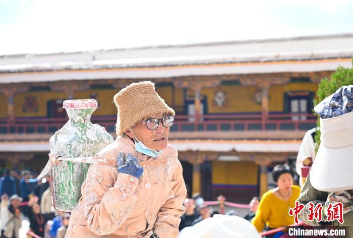 人群中的志愿者旺久來自山南市,自己做生意。他說:“放下家里的事情,過來朝佛也幫忙粉刷,帶了牛奶過來,后面幾天也要參加?!?/p>