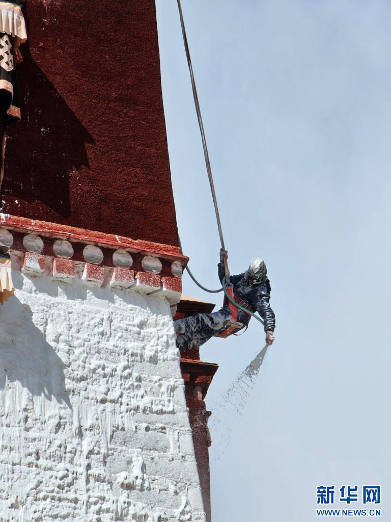 10月18日,布達(dá)拉宮“美容師”在噴灑涂料。新華網(wǎng) 柑丹鴦琦 攝