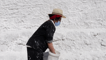 工作人員將牛奶、蜂蜜、藏紅花、白灰等材料按比例混合,經(jīng)過(guò)濾后對(duì)布宮墻體進(jìn)行噴涂,這樣既可以保護(hù)建筑物表面不受腐化變質(zhì),也可更加美觀(guān)。