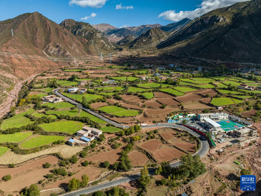 這是10月20日拍攝的西藏芒康縣如美鎮(zhèn)拉烏村(無人機照片)。圖中公路為國道318線。新華社記者 孫非 攝