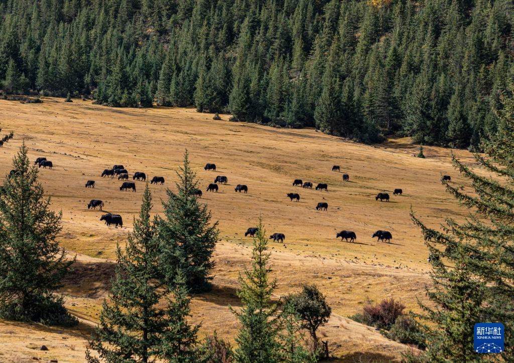 這是在西藏芒康縣如美鎮(zhèn)拉烏村附近拍攝的牧場風光(10月20日攝)。新華社記者 孫非 攝
